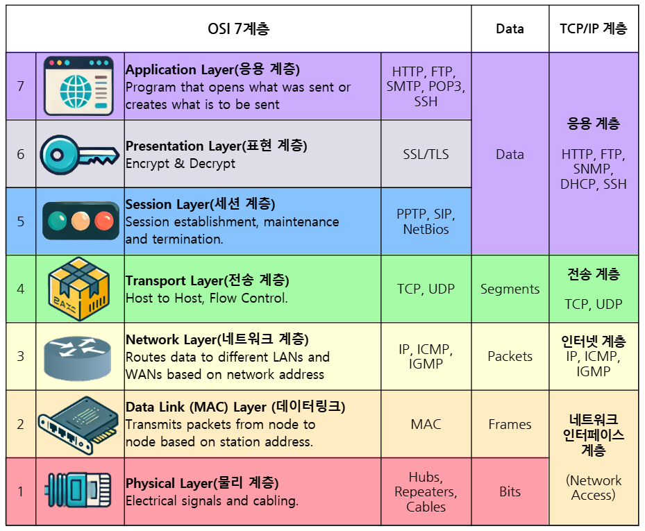 | 7 | 응용 계층 (Application) | 사용자 서비스 제공 | HTTP, FTP, SMTP, DNS |